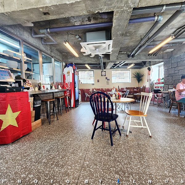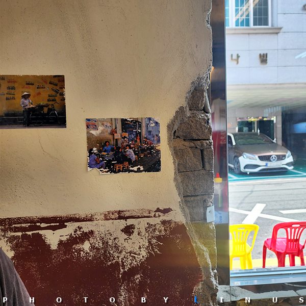 벽돌이 드러나보이는 인더스트리얼(?)한 인테리어의 벽에 베트남 현지 시장의 쌀국수 거리 사진이 보인다.