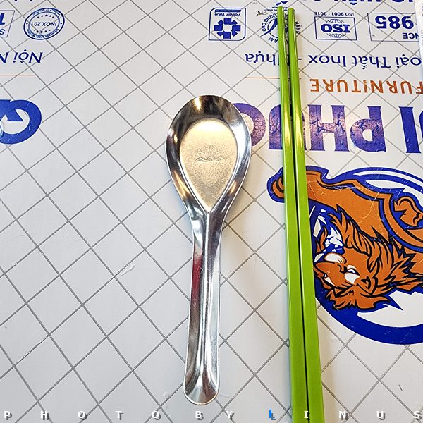 쌀국수 국물을 떠먹는 스푼과 젓가락. 식탁도 스테인리스 식탁 위에 비닐을 씌운 느낌의 딱 현지 느낌.^^;