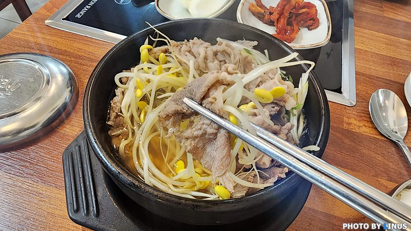 아삭한 콩나물과 야들야들한 돼지고기의 만남! 양념에 찍어먹으면 맵지않은 콩불 느낌도 난다.