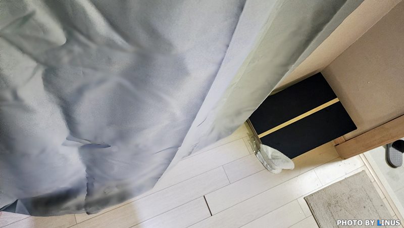 자세히보면 커튼이 조금 부풀어 올라있다. 아래쪽에서 외풍이 들어온다는 말. 바닥쪽을 만져보면, 앞서는 대리석이고 강화마루고 둘다 차가웠는데... 이제 커튼 안에 위치한 강화마루바닥은 냉기가 거짓말같이 사라졌다!