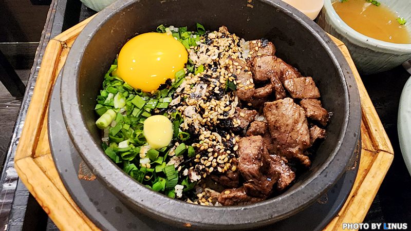 이것이 바로 스테이크 솥밥의 모습! 오른편으론 잘구워진 스테이크가, 가운데는 양념이, 왼쪽으론 쪽파를 송송썰어놓았고 계란 노른자가 한알 올라가있다. 솥밥은 한식인데... 스테이크는 양식이니... 이것은 한식일까, 양식일까~