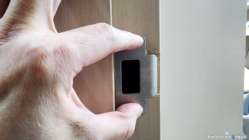 저 길죽한 걸 각축이라고 하는데 각축에 있는 조그만 버튼을 눌러 문 바깥쪽에서 안쪽으로 넣어 끼워준다.