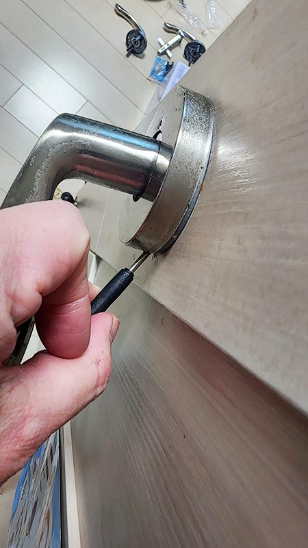 이 부분이 좀 어려웠는데... 다른 블로그 후기를 보면 저 동그란 부분에 나사가 두개있어서 바로 풀면 되는데... 우리 집 문 손잡이는 커버(캡)가 한번 더 씌워져있는 상태라 저렇게 드라이버로 커버(캡)를 들어올려서 제거해주고 작업을 시작해야한다.
