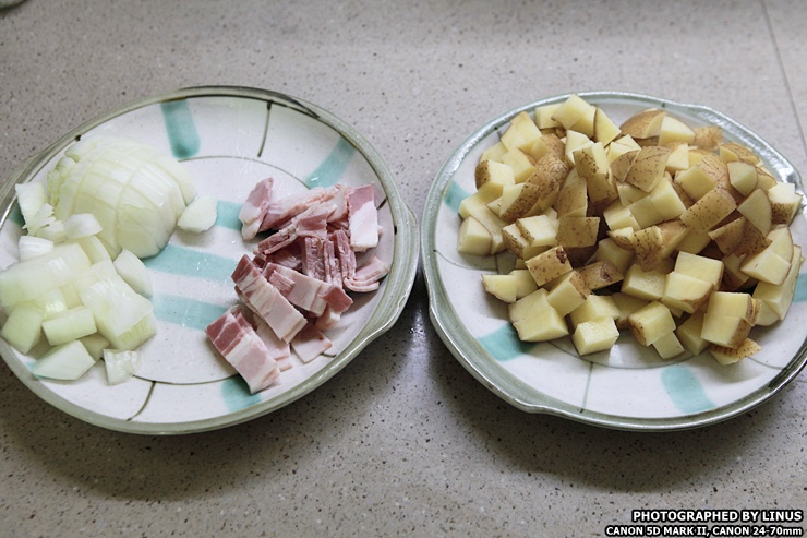 잘 잘려진 준비물. 양파, 베이컨, 감자가 되겠다. 그러고보니 감자는 정말 요리에 있어서 없어서는 안될 식자재다. 모든 종류의 요리에 다 들어가며, 프렌치 프라이, 베이컨 감자 볶음, 감자 샐러드 등, 감자를 주인공으로 한 요리만도 손으로 다 꼽지 못할 정도로 많다.