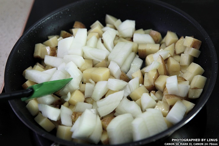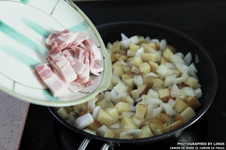 다음으론 양파를 넣어준다. 이때 베이컨은 제일 늦게 넣어주는게 포인트인데... 베이컨을 양파, 감자와 함께 넣을 경우 감자와 양파가 익는데 걸리는 시간때문에 베이컨이 쭈글쭈글 딱딱해지는걸 피하기 위함이다.
