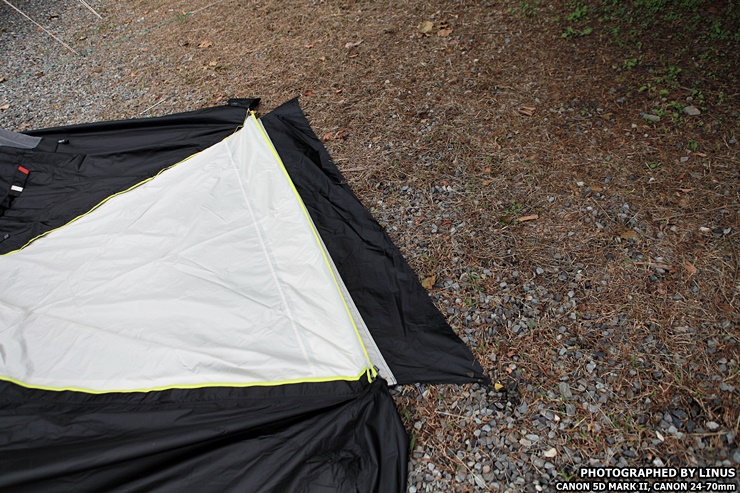파쇄석위에 그라운드 시트를 먼저 올린다. 저 그라운드 시트는 방수포 소재로 되어있어 바닥으로부터 올라오는 습기와 비가 내릴 경우 이너텐트쪽으로 빗물이 올라오는걸 막아준다.