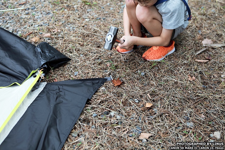 맨 뒷편에 팩을 꼽아 뒷쪽부터 고정을 해두면 텐트가 흔들거리지 않아 이후 작업을 하기 쉽다.