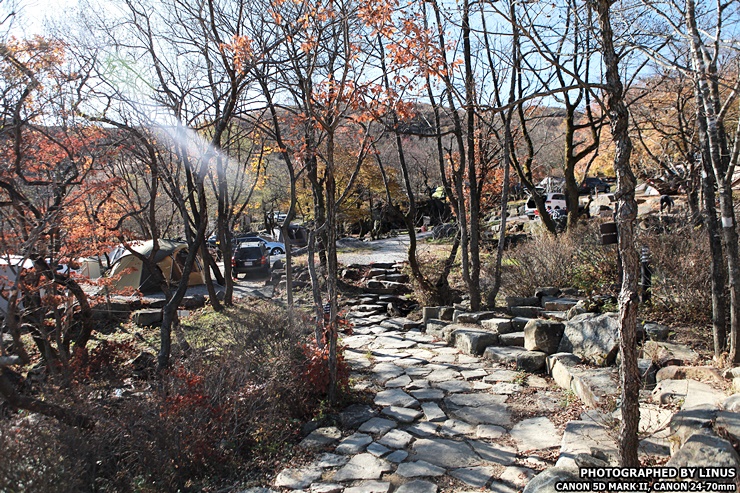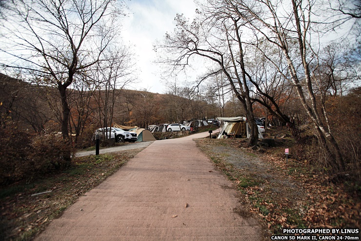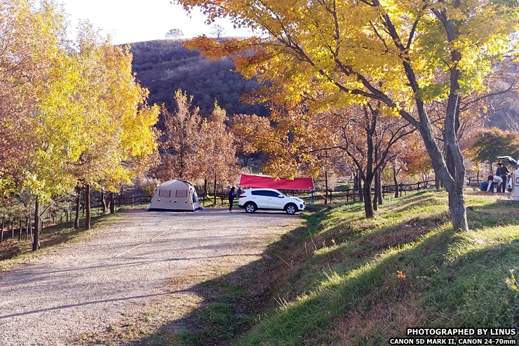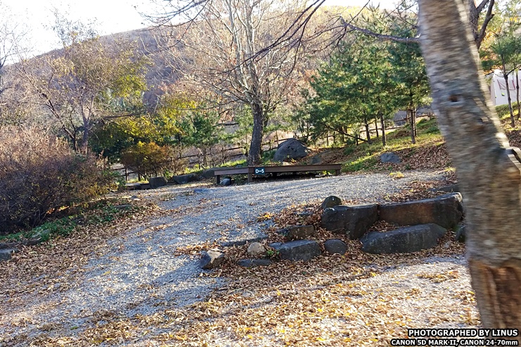 두둥! 그리고 바로 이곳이 숲속 사이트인 D 사이트! 가장 인기가 높다. 울긋불긋한 단풍나무들 사이로 보이는 캠핑장의 경치가 일품이다. D사이트는 무려 D1에서부터 D57까지 사이트로 구성되어있는데 형태도 되게 다양하다. 먼저 3x3 데크 사이트는 D1, D3, D4, D5, D6, D7, D8, D9, D10, D11, D12, D13, D14, D18, D21, D36, D37, D39, D40, D41, D42, D43, 파쇄석 사이트는 D24, D25, D26, D27, D28, D29, D30, D32, D34, D45, D51, D52, D53, D54, D55, D56, D57, 4x6 데크 : D31, D33, D35 , D44, 두팀전용 파쇄석 사이트 : D16(D16,D17), D19(D19,D20), D22(D22,D23), D38), 단체석 : D1 (3~5팀), D57 (2~3팀)으로 나뉘어져있는데... 그중 라이너스씨가 예약한 사이트는 3x3 데크가 있는 D6 사이트!
