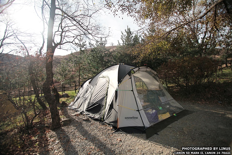 짜잔~ D6 사이트에 설치된 라이너스씨의 미라클패밀리 텐트. 사진상에는 안보이는데 오른쪽 편엔 3X3 데크가 있고 왼쪽 파쇄석 부분에 텐트를 쳤다. 그리고 이번에 개시한 동계용 우레탄 창도 설치 완료! 시야가 확보되니 텐트 안 공간도 더 넓어보이는 효과가! 숲속의 텐트 느낌?