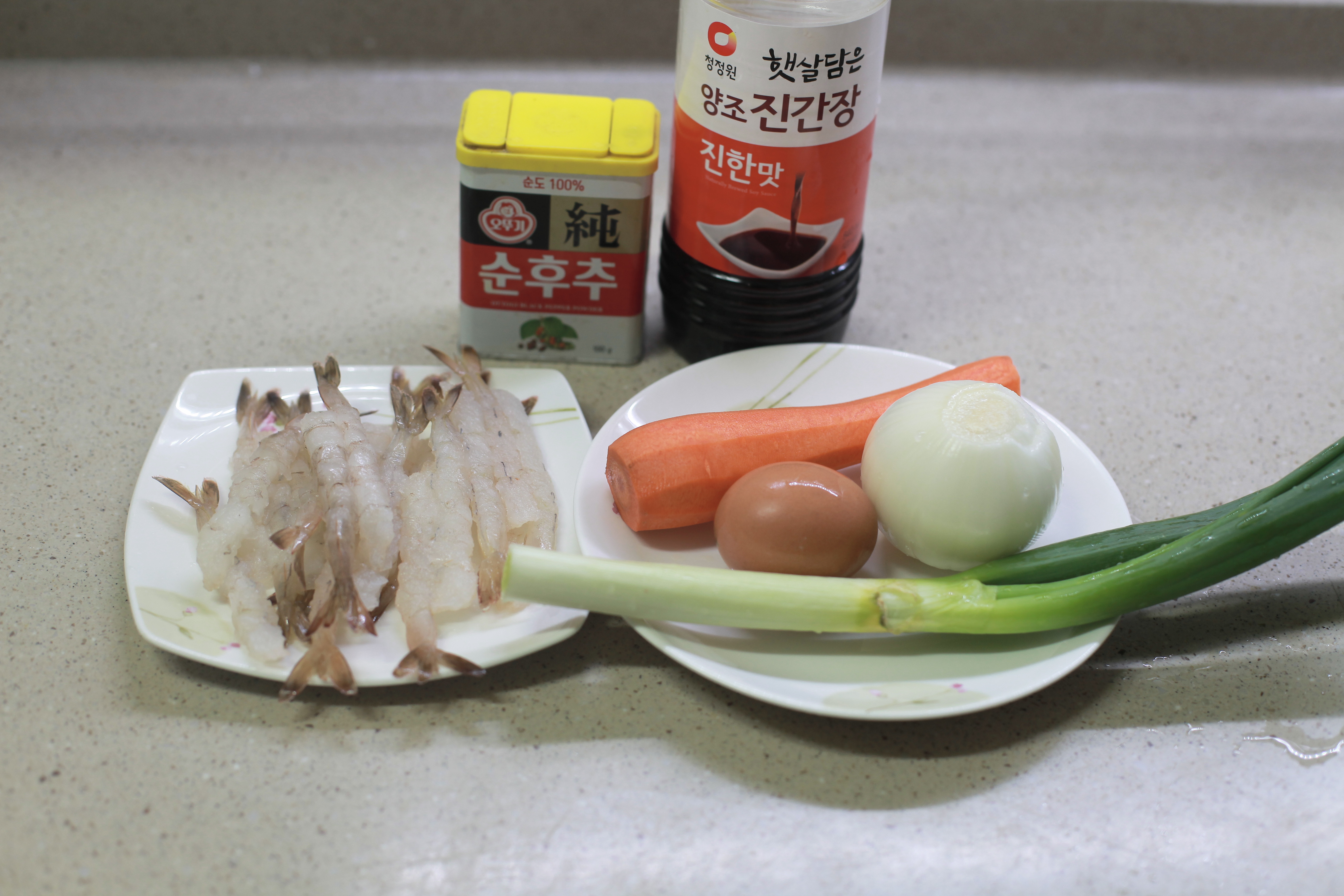 새우볶음밥(2인분) 준비물: 새우 200g(흐르는 물에 가볍게 씻어서 껍질을 벗겨준다.), 대파, 계란, 당근, 양파, 후추, 진간장, 소금, 깨, 취향에 따라 굴소스.
