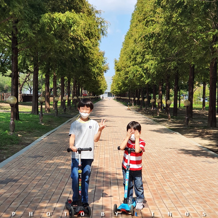 초전공원의 또다른 별명(?)은 씽씽카의 명소. 인라인, 씽씽카를 타는 아이들이 정말 많다. 주원이 수현이도 씽씽카를 타고 어디론가로 향한다.