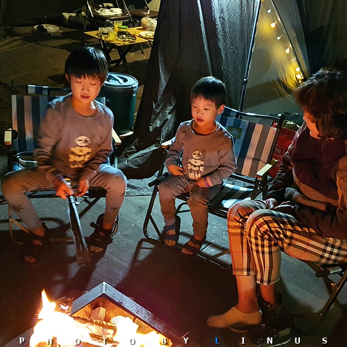 식사후 장작불로 불멍중인 아이들과 장모님. 너무 좋다, 즐겁다를 연발해주셔서 뿌듯했다.^^