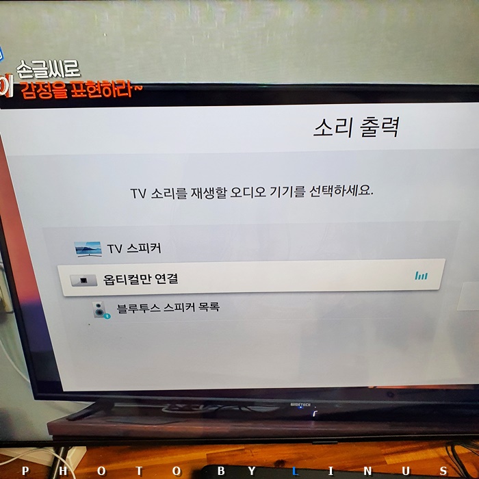 TV 소리를 재생할 오디오 기기를 선택하라고 나오는데 이때 TV 스피커를 옵티컬만 연결로 선택해준다. 이렇게 하지않으면 TV 내장 스피커와 브리츠 스피커 두 군데에서 소리가 동시에 나와서 혼란스럽다.^^;
