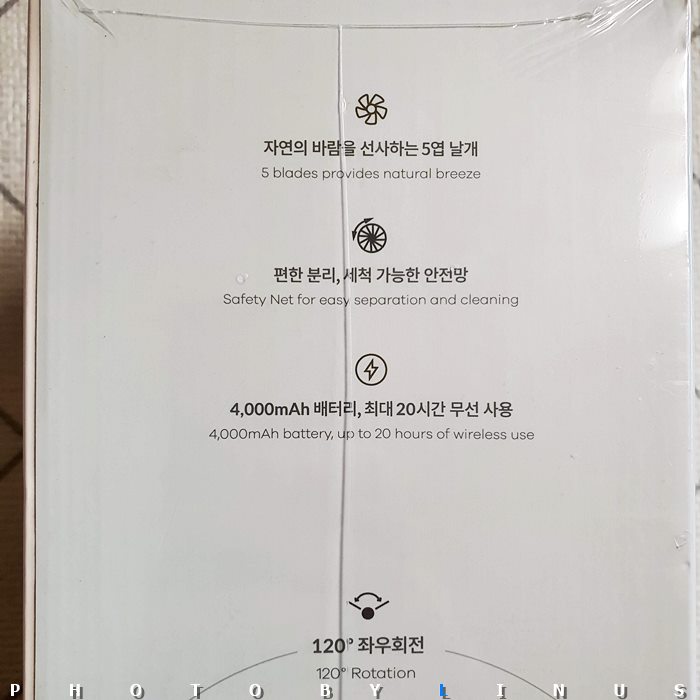 박스 뒷면에 제원이 나온다. 6W에 DC5V 1.5A. 4000MAH 리튬이온 전지를 탑재하고 있고, 배터리 수명은 1,000번이상 재충전 가능하다고... 사용시간은 완충시 최소 4시간에서 최대 20시간이며 완충시간은 3시간이다. 부피는 165x268x131 mm로 일반선풍기나 써큘레이터에 비해서는 많이 작으나 휴대용 손풍기(?)보다는 큰 편. 무게는 406g 으로 상당히 가벼운편이다.
