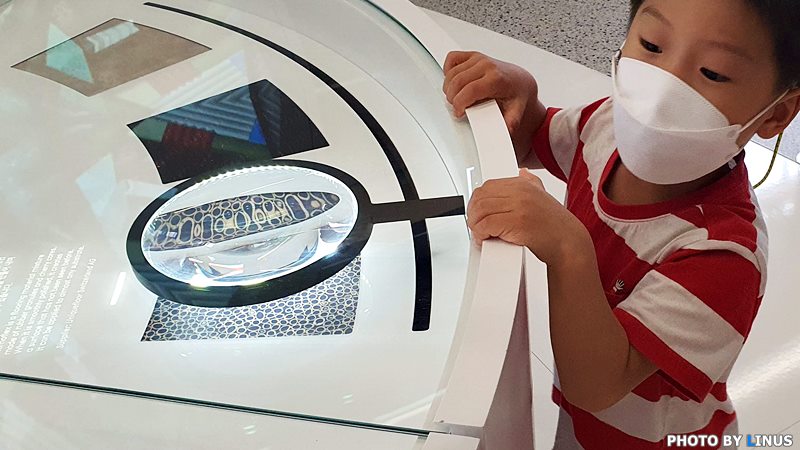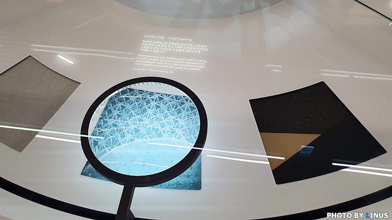사람이 원형으로 된 각종 소재를 형상화한 그림 앞에 서면 돋보기(?)가 거기에 맞춰지고...