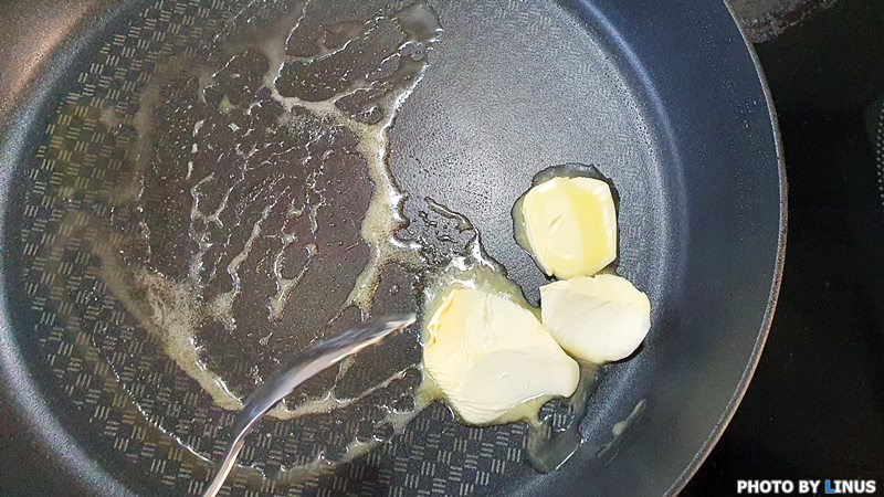 이제 버터가 등장할 시간. 버터를 숟가락으로 적당량 덜어... 프라이팬에 넣어준다. 참고로 필자는 이마트 피코크의 가성비 제품, 소금을 넣지 않은 쿠킹버터를 주로 사용한다. (롯데나 파스퇴르꺼도 괜찮은편...^^)