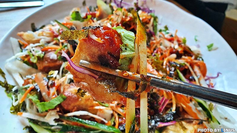 드디어 등장한 비빔만두. 맨 아래 깔려있는 만두와 위로 휘감듯이 쌓아올린 야채의 산이 예사롭지않다.
