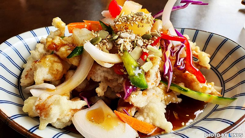 먼저 등심 탕수육 등장이요~ 찍먹이냐 부먹이냐 고민할 필요가 없다.ㅠㅠ; 어차피 부먹으로 나온다.^^; 바삭하게 익은 탕수육 위로 오이, 피망, 양배추, 양파, 당근, 통조림 과일, 해바라기씨 등 다양한 야채가 수북히 올려져있다.