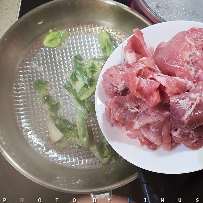 대파 향의 향긋한(?) 향이 올라올때까지 살살 볶아주자. 이렇게 대파와 마늘 향이 나게끔 볶아주고 돼지고기를 볶아주면 누린내와 잡내를 잡아줄 수 있다.^^