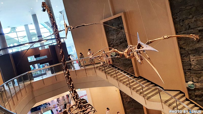 2층에서 내려다본 모습. 기다란 공룡 뼈와 주변을 날아다니는 익룡 프테라노돈의 모습.