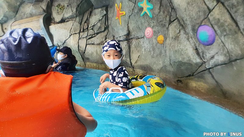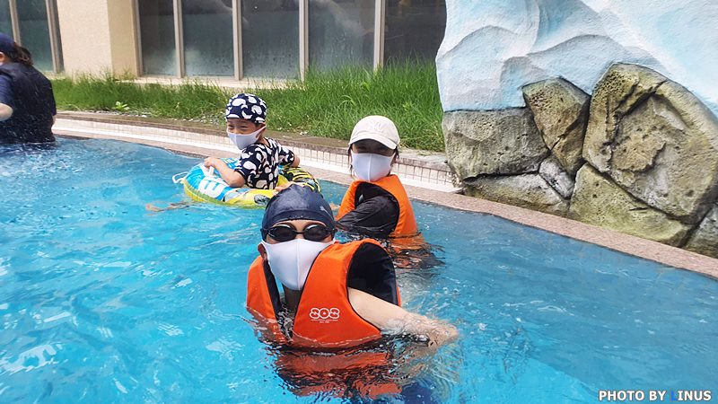 마스크를 쓰고 튜브와 구명조끼를 하고 즐거워보이는 아이들과 뭉이. 이곳에서는 수모나 머리를 감싸는 일반 캡 모자도 허용된다.