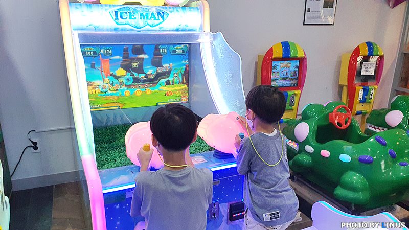 수영을 마치고 샤워까지 한다음 입구쪽에 있던 게임존으로... 물대포를 발사하는 게임인데 아이들이 신났다.ㅋ