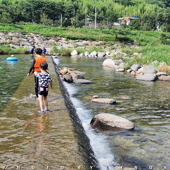 부랴부랴 설영을 마치고 계곡으로 내려갔다. 가운데의 커다란 돌을 중심으로 얕은 계곡, 조금 더 깊은 계곡으로 나눠져있고 깊은 계곡도 그리 깊진 않아 아이들이 물놀이 하기에 딱 좋을 것 같았다. 물론 안전제일이니 튜브나 구명조끼는 필수! 그리고 계곡 입구에는 커다란 검정 타프(?)를 쳐놓아 그늘도 만들어 두었다. 둘레길 워터파크 개장!
