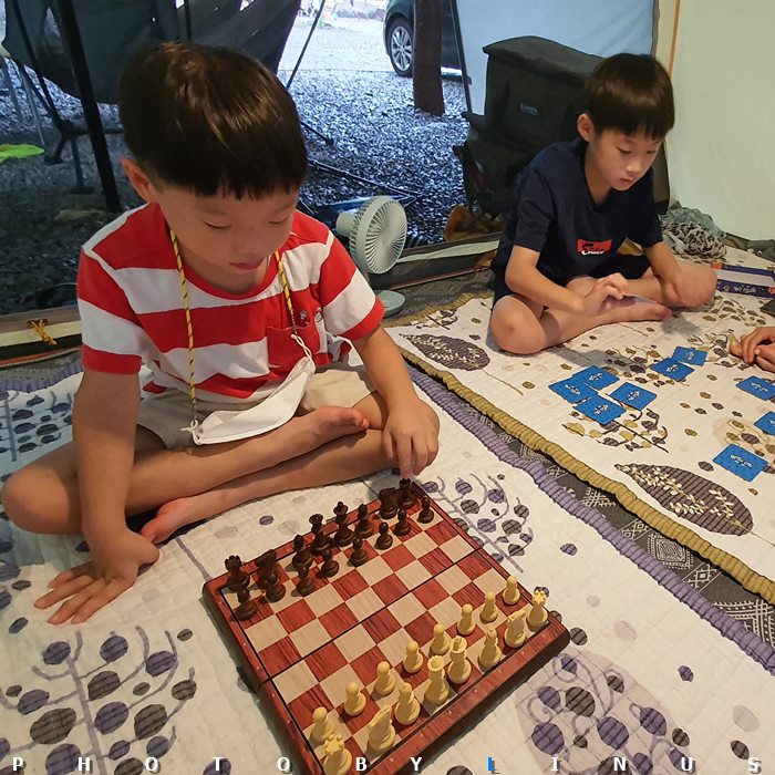 일기예보가 정확했는지... 텐트 밖으론 장대비가 퍼붓고...ㅠㅠ 우리들은 체스와 짝맞추기 카드 게임을~ 둘쨋날은 비가 왔다 안왔다 하는 바람에 타프 아래에서 비멍을 하거나 게임을 하며 시간을 보냈다. 나름 가족간에 돈독한 시간을~ ^^;