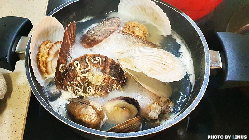 뚜껑을 닫고 삶아준다. 가리비의 삶는 시간은 약 10분정도. 삶는 시간이 너무 길어지면 가리비가 질겨지니 조심.^^;