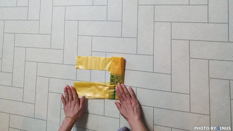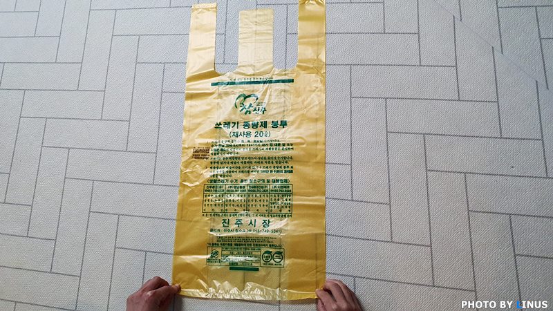 먼저 종량제 봉투를 준비한다. 라이너스 씨가 주로 사용하는 봉투는 20리터짜리인데... 경남 진주시의 종량제봉투의 규격과 리터당 가격은 100리터 2850원 50리터 1430원 20리터 590원 10리터 300원 5리터 160원, 30리터은 없다. 판매처는 편의점이나 슈퍼마켓, 마트 등이고 다른 지역 사용은 불가하다. 심지어 타지역이 아닐지라도 부산시처럼 큰 도시는 특정 동이 아니면 안되는 경우도 있다. 타지역으로 이사갈땐 환불이나 당근마켓을 고려해 보셔야할듯. 각설하고 봉투를 저렇게 잘 펼친다.