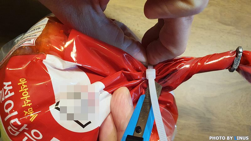 마트에서 김치를 사면 비닐봉지 안에 김치가 포장되어있고 위쪽은 혹시나 국물이 흐를까봐 케이블 타이로 한번 더 밀봉이 되어있다. 물론 국물이 흐르지않는것도 좋고 깔끔한 포장도 좋은데 단점은 역시 케이블타이를 푸는 게 어렵다는 것. 그렇다면 어떻게 하면 김치봉지의 케이블타이를 쉽고 깔끔하게 그것도 '재사용'가능하게 풀 수 있을까? 오늘은 친절한 라이너스 씨와 함께 알아보도록 하겠다.^^