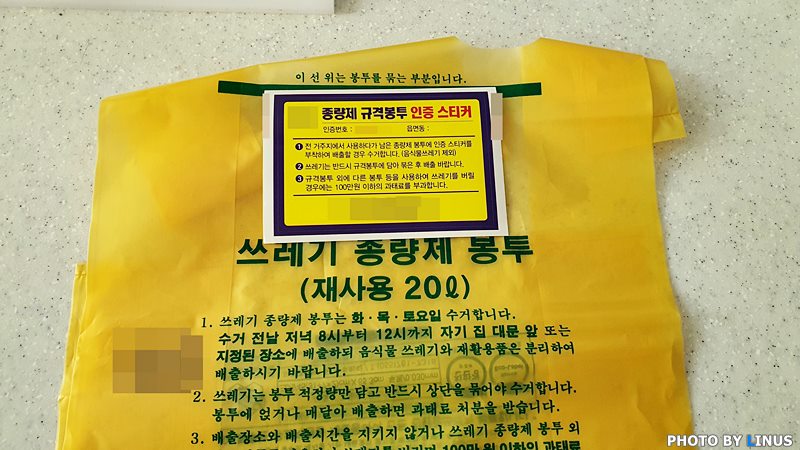 이전 거주지에서 사용하던 종량제 봉투 위에다가 이렇게 스티커를 붙이고 배출하시면 되겠다. 라이너스 씨는 50리터짜리 19장에 20리터짜리 한방을 교환했으니 50리터짜리 개당 가격 1,430원에 곱하기 19에, 20리터짜리 590원을 더하면 무려 27,760원이 이득!