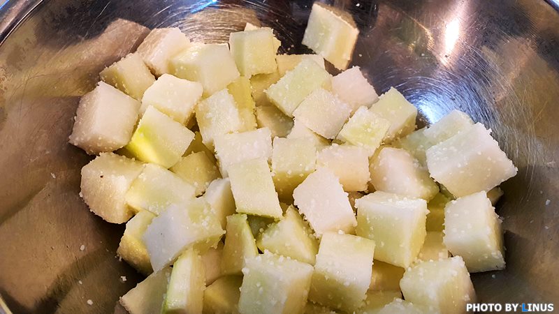 소금이 잘 묻은 무. 이제 이렇게 1시간을 절여둔다.