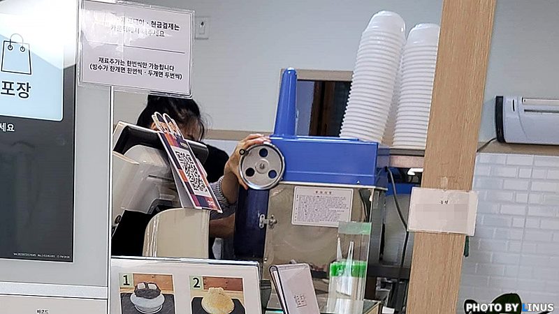 예전에는 보이지않던 키오스크가 보인다. 팥빙수는 4500원, 콩빙수는 4500원, 녹차빙수는 5000원, 우유빙수는 3500, 토마토 빙수는 5500원, 튀김찐빵2개는 1500원이다. 개인적으론 팥빙수와 토마토빙수가 제일 맛있었던듯.ㅎ 튀김찐빵도 겉바속초(?)로 별미인데... 오픈하고 얼마안가면 바로 품절되어버린다.ㅠㅠ 올 여름에 두번이나 왔는데 두번이나 품절.ㅠㅠ 저 통영의 오미사 꿀빵보다 사먹기 힘든듯.
