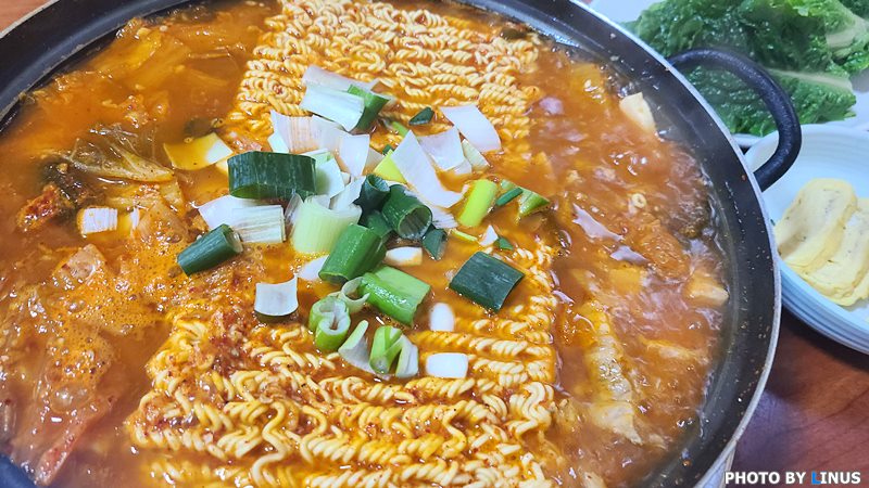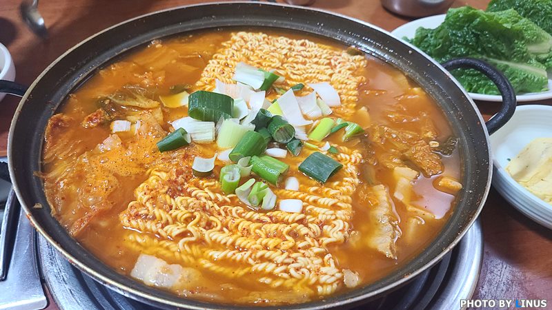 두둥! 라면사리 2개가 올라간 김치찌개의 모습. 김치찌개 안에는 김치와 두부, 돼지고기등이 들어있으며 라면사리 위로 파가 송송 썰어져 올라가있다. 곧있으니 보글보글 끓기시작한다.