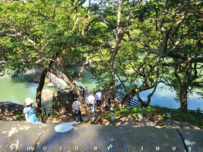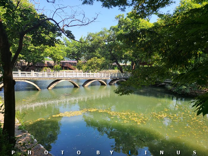 돌다리와 푸르른 나무, 초록색 연못이 잘 어우러져 아름답다.