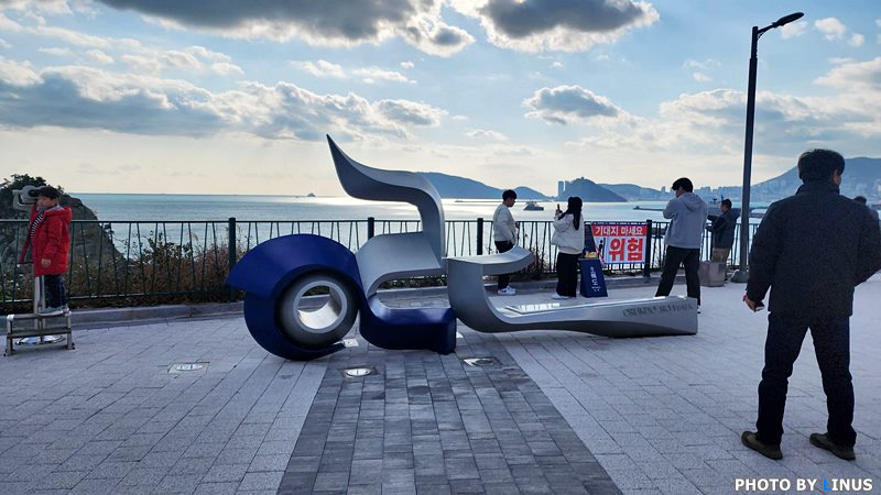 포토 스팟인듯하다. 조형물의 멋진모습. 자세히보면 ㅇㄹㄷ 즉 오륙도를 형상화하고있다. 타이포그라피인듯.ㅋ 뒤편으로 사직찍는 데이트중인 연인들, 가족들이 많이보인다.