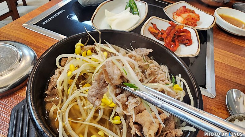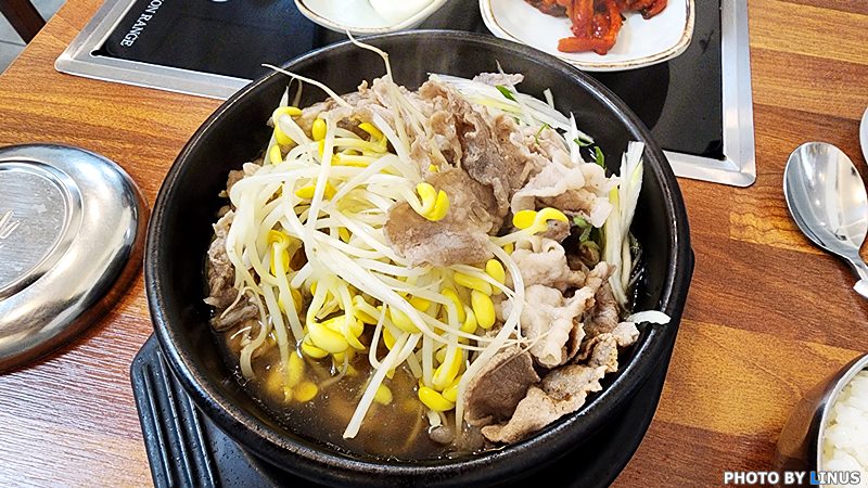 아삭한 콩나물과 야들야들한 돼지고기의 만남! 양념에 찍어먹으면 맵지않은 콩불 느낌도 난다.