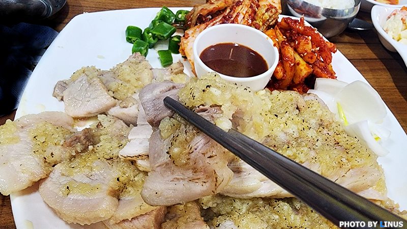 다행히 대기가 길지 않았기에 금방 나왔다. 어른 2명, 어린이 2명이라 중 사이즈와, 대 사이즈를 고민하다가 대로 시켰는데... 솔직히 생각보다 엄청 양이 많아서 나중엔 조금 힘들었다.^^; 마늘보쌈이란 말이 명불허전이라 보쌈고기위에 마늘이 소복히 올라가 있다.