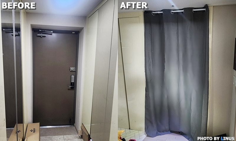 인근 환경도, 편의시설도 좋아서 다 마음에 드는데 한가지 불만이 있었으니 그건 바로 단열문제. 진주시에서는 지은지 비교적 오래되지않은 아파트임에도 현관, 창문, 베란다 등 우풍이 심한편이라 난방비에 신경이 쓰인다.^^; 그래서 입주초기부터 방풍 필름, 우풍 방지 비닐, 뽁뽁이, 우팡 방지 고무패킹, 문풍지 등 다양한 방법들을 사용해보기도 했었는데... 그중 가장 체감이 크게 되는 게 바로 현관쪽에서 들어오는 냉기였다. 그래서 준비했다! 친절한 라이너스 씨와 함께하는, 실내온도 5도 상승! 비싼 현관 중문 대신, 현관 방풍 커튼 셀프 설치 도전! (난방비 절약 꿀팁)