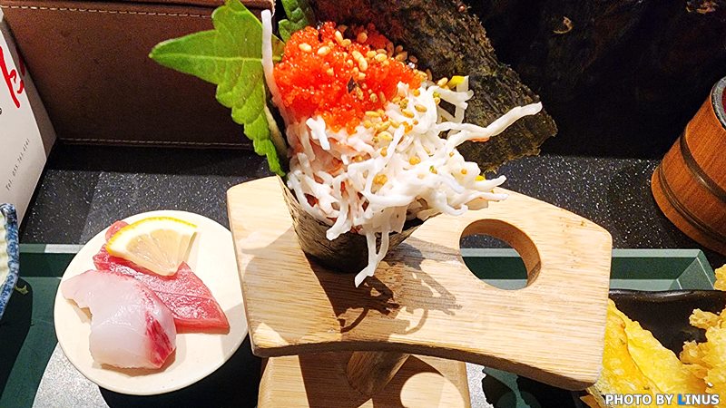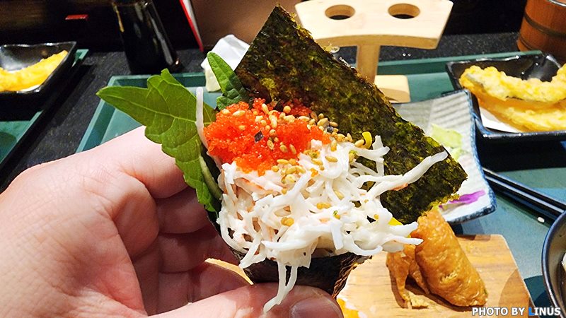 크레미가 들어간 김으로 감싸진 데마끼. 위에는 날치알이 올라가 있어 입에넣고 씹으면 김의 쌉싸름한 맛과 크래미의 달착지근한맛 날치알의 톡톡 터지는 식감이 동시에 느껴진다.^^