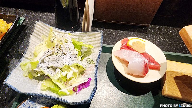 우리가 시킨 런치세트B. 점심특선세트는 런치A 초밥 7개, 데마끼, 튀김, 우동, 샐러드 11,000원. 런치B 초밥 8개, 회 2개, 데마끼, 튀김, 우동, 샐러드 14,000원. 런치C 초밥 12개, 회 2개, 데마끼, 튀김, 우동, 과일, 샐러드 18,000원. 등으로 구성된다. 양이 어느정도인지 몰라서 고민하다가 런치B로 시켰는데 적당히 배부르고 딱 괜찮았던 거 같다. 돌도 씹어먹을(?) 한창 먹을 나이(?)면 런치 C도 괜찮을지도...