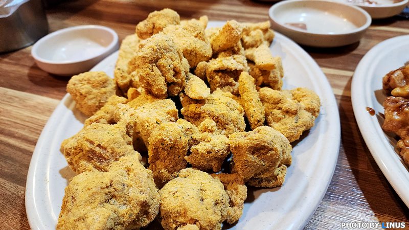 라이너스 씨가 요즘 좋아하는 눈꽃치즈치킨 순살. 다른 곳에선 BHC에선 뿌링클, 후라이드참잘하는집에서는 눈꽃치즈 치킨등으로 불리는데... 비슷한 느낌이긴한데... 매장에서 먹으면 갓튀겨낸 치킨에 바로 눈꽃치즈를 솔솔 뿌려서 비주얼 최상!