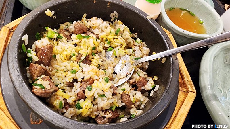 이제 본격적으로 식사를~ 살짝 누룽지화된 밥알들이 야채와 함께 입안을 굴러다니고 잘익은 스테이크가 씹는 맛을 더해준다. 만족!