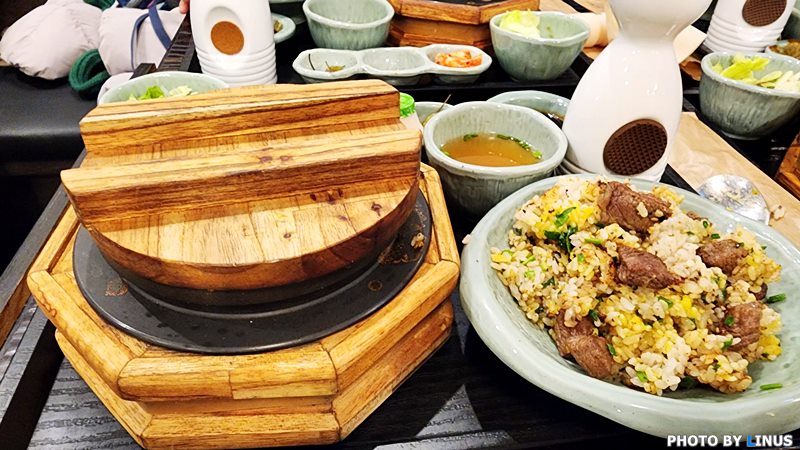 드디어 모습을 드러낸 스테이크 솥밥! 이렇게 트레이위에 1인분씩 올려져서 나온다. 야채, 밑반찬, 양념, 미소된장국, 솥밥, 그릇, 육수가 나온다.