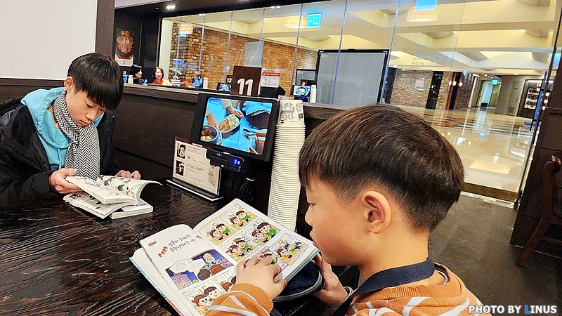 우리는 스테이크 솥밥 4개를 시켜놓고 기다리는중. 아이들은 교보문고에서 득템한 만화책을 보고있다.ㅎㅎ; 밖으로도 대기줄이 하나도 보이진 않지만... 거짓말 안보태고 딱 우리음식 나오자마자 실내는 만석이되고 밖은 웨이팅 줄이 생겼다.;