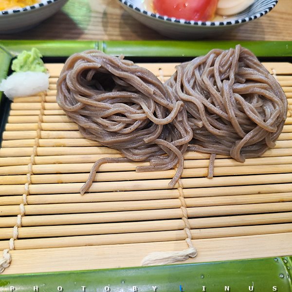 점심시간에 방문하면, 점심세트가 주문 가능한데... 점심세트A 10,900원 [초밥8개, 우동, 튀김(고구마, 새우)], 점심세트 B 13,900원[초밥10개, 우동, 계란푸딩, 튀김(고구마,새우)]으로 구성되어있다. 라이너스씨와 뭉이는 점심세트 B로 정했다. 밑반찬과 모밀국수가 나왔다.