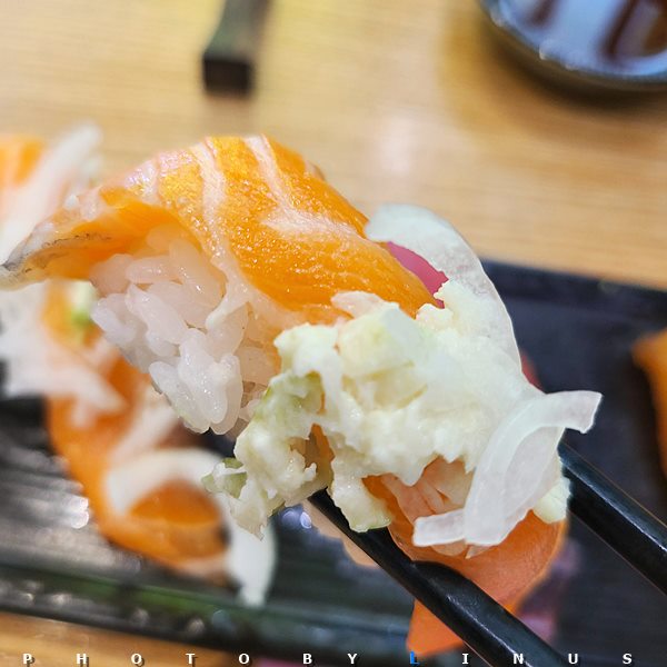 연어초밥도 양념과 양파의 맛과 잘 어우러진다.